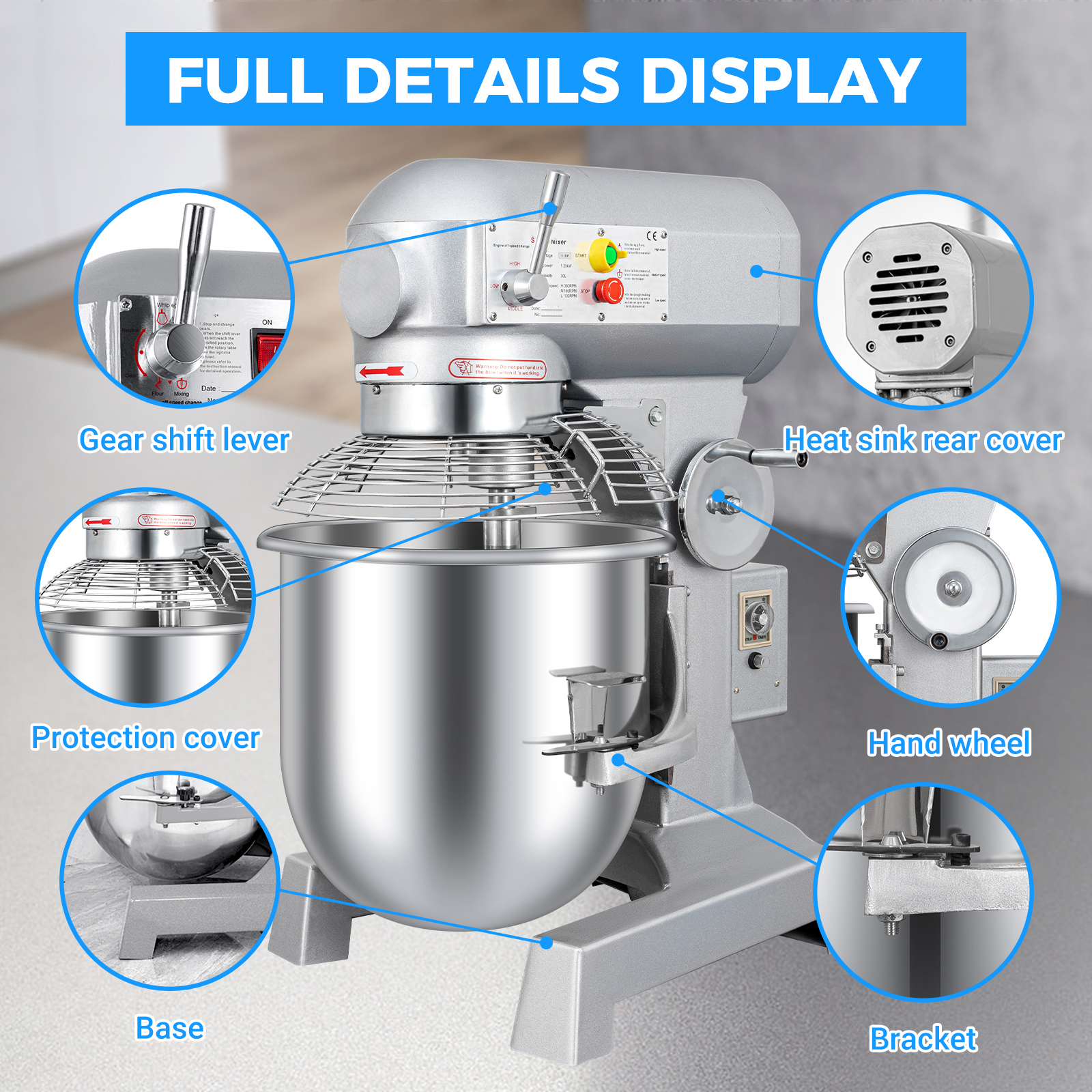 Our 30QT commercial stand mixer is designed for professional kitchens, featuring a 30qt stainless steel bowl and a powerful 1250W motor. Engineered for bakeries, restaurants, and hotels, it comes with three mixing attachments (dough hook, flat beater, wire whisk) to handle a variety of mixing needs.