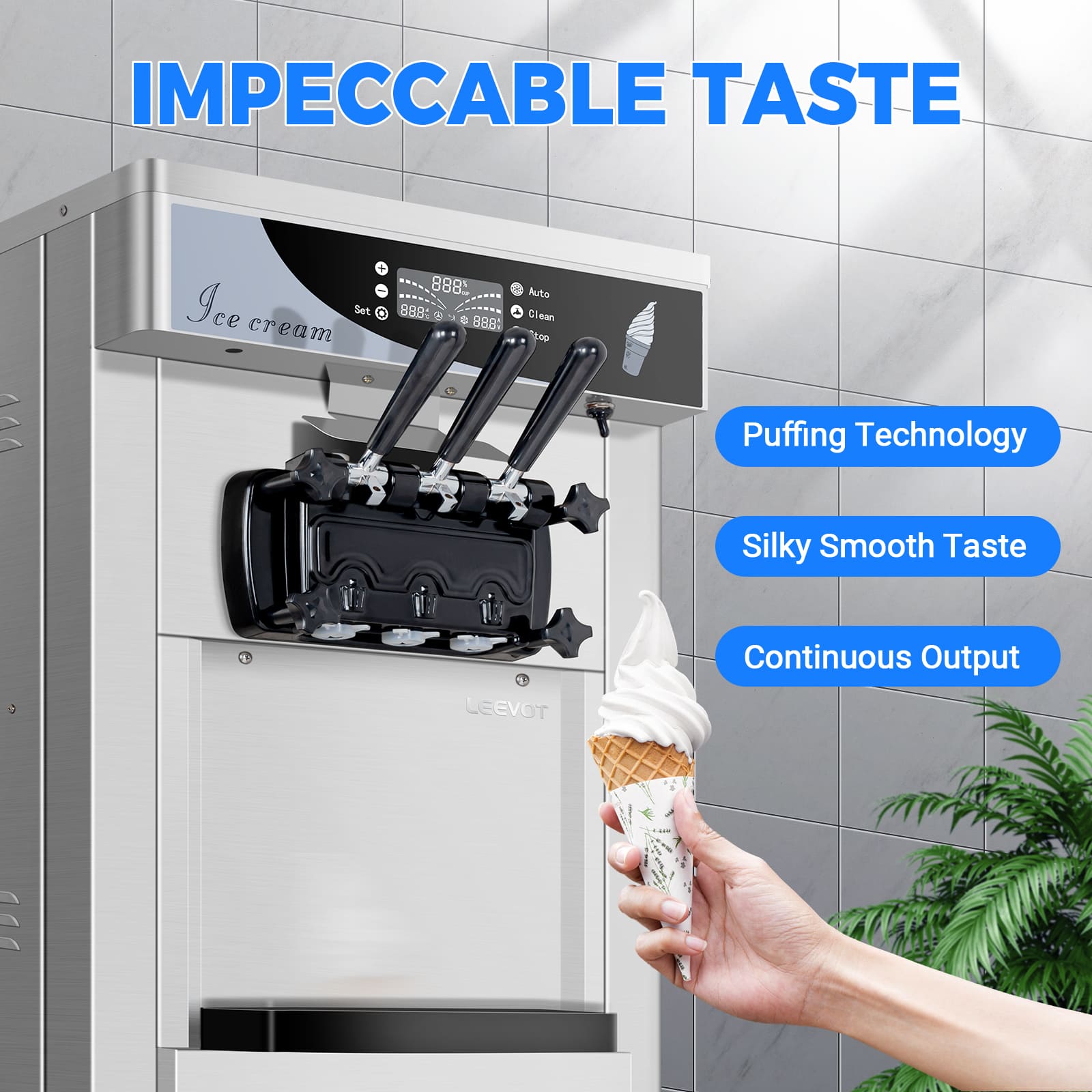 The BQL-828 soft serve ice cream machine is designed for high-volume commercial use, producing 18-28 quarts per hour with three flavor options (two single, one mix). Equipped with dual 6L mixing hoppers and 2L freezing cylinders, it delivers 150-200 servings per hour. The 1800W motor ensures powerful and efficient performance, while the smart LCD panel allows easy operation, texture adjustment, and one-click self-cleaning.