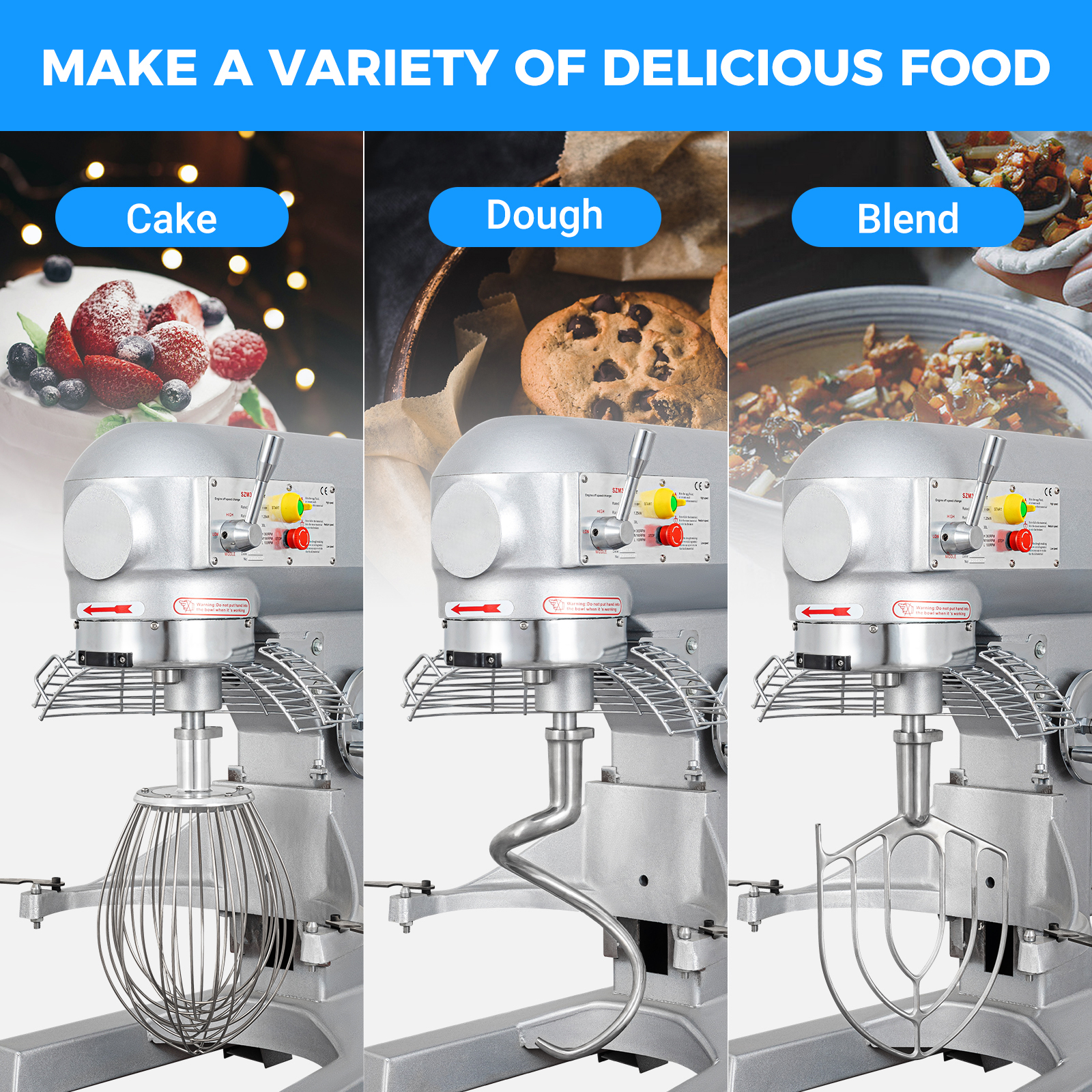 Our 30QT commercial stand mixer is designed for professional kitchens, featuring a 30qt stainless steel bowl and a powerful 1250W motor. Engineered for bakeries, restaurants, and hotels, it comes with three mixing attachments (dough hook, flat beater, wire whisk) to handle a variety of mixing needs.
